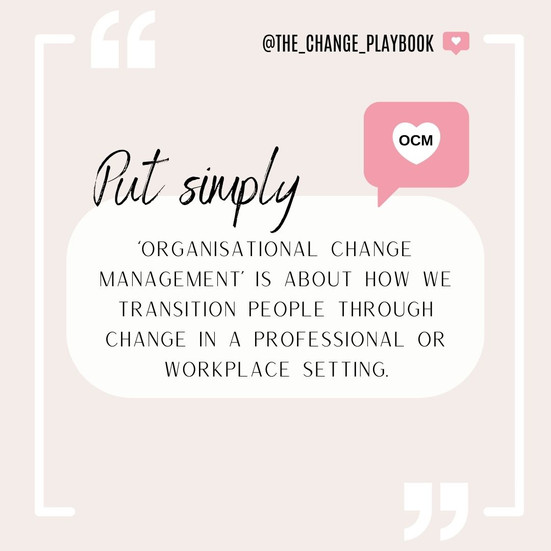 If Change Management is about the process we use to guide people through change, then ‘Organisational Change Management’ is simply about how we transition people through change in an organisational (or ‘work based’) setting.